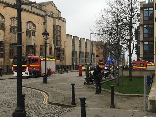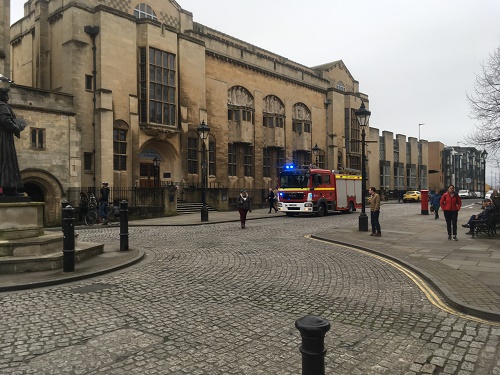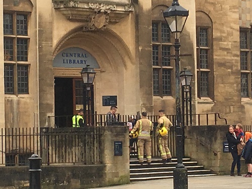 Bristol fire fighters responded to fire alarms at the city’s Central Library this evening. Five appliances from Avon Fire and Rescue Temple, arrived at the library, including one aerial ladder platform.