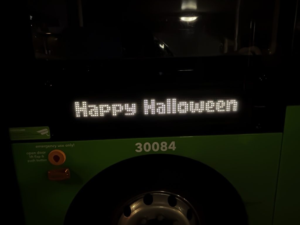 The bus, parked on Broad Quay yesterday evening, was festooned with messages of Happy Halloween and festive emojis.