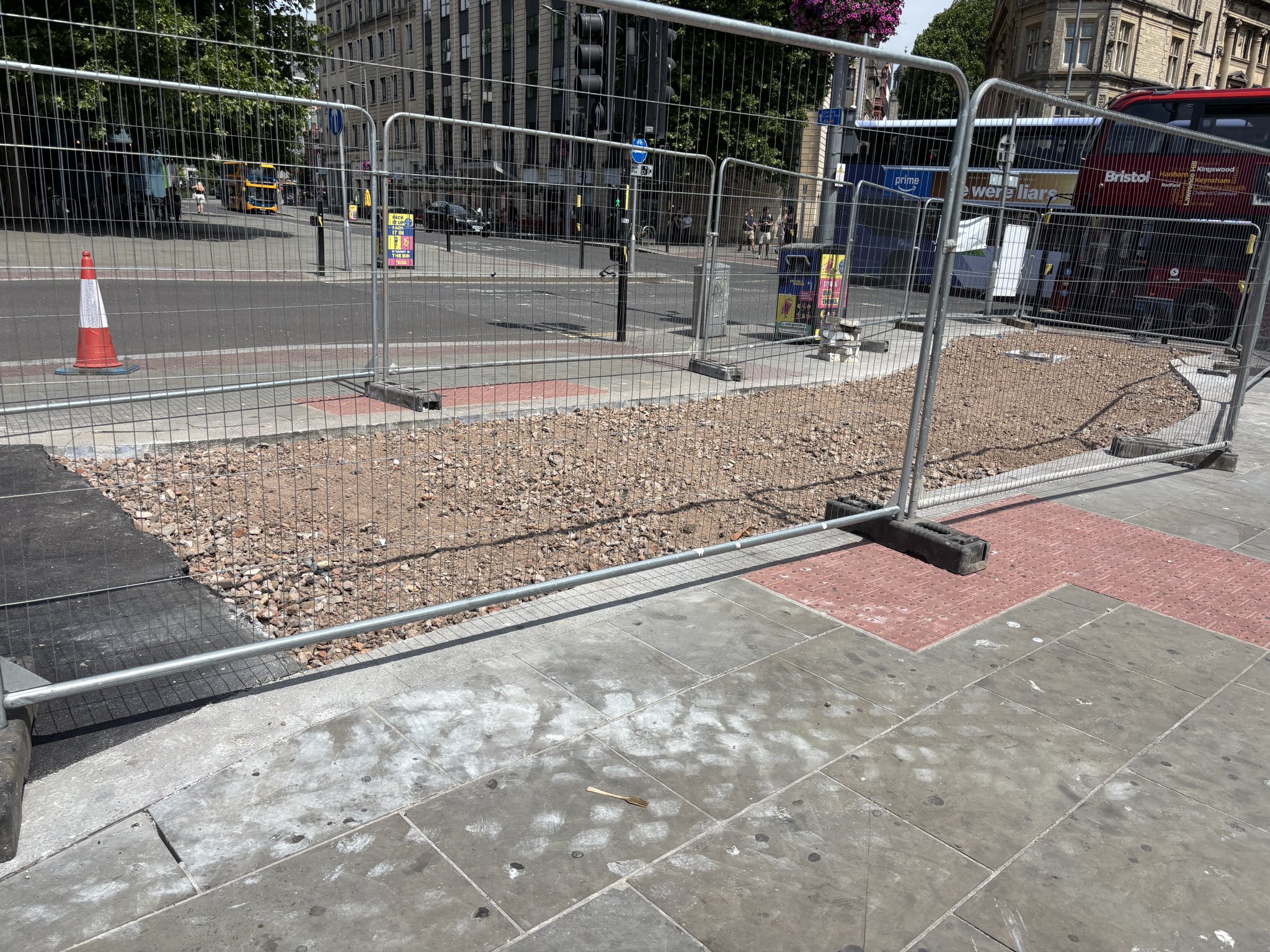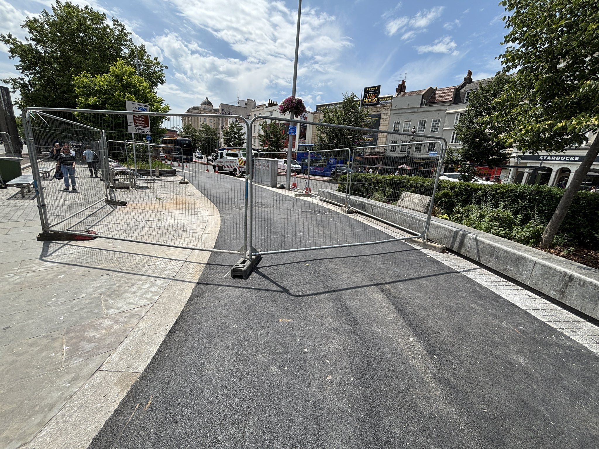 Tarmac was also laid in the areas formerly inhabited by the Weak Fountains this summer. The work included some questionable arrangements around the location of benches. The photograph below also shows the cycle lane prior to work to improve its visibility.