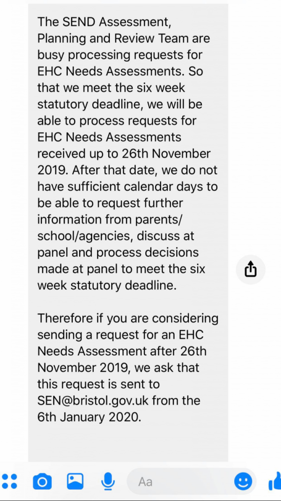 The Headteacher Update of 22 November 2019, informed Bristol education staff that the SEN team were going to close up over Christmas. According to the email sent out, there was not enough weeks to turn Education Health Care Needs Assessments around within the 6 week legal time frame due to the holidays.