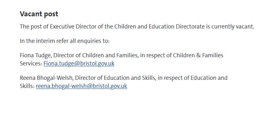 Bristol City Council’s website currently says ‘The post of Executive Director of the Children and Education Directorate is currently vacant.’