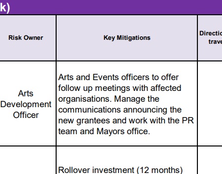 The ‘Key Mitigations’ for this states: ‘Arts and Events officers to offer follow up meetings with affected organisations. Manage the communications announcing the new grantees and work with the PR team and Mayors office.’