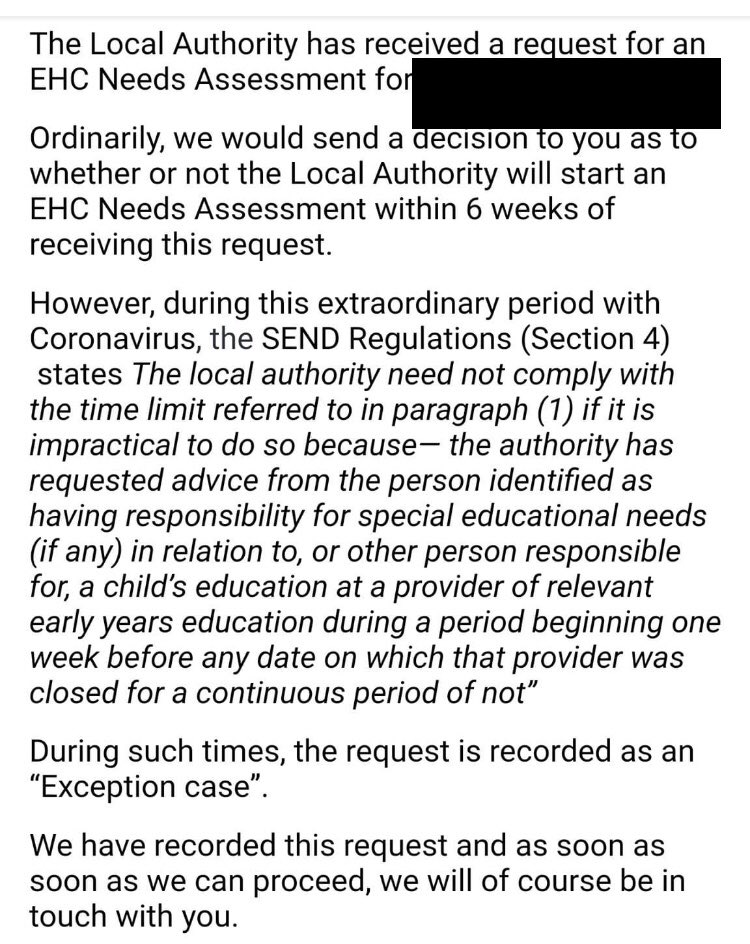 @CllrAnnaKeen @educatinghurley can we please have some clarification on the EHCNA request process? We are hearing of the use of exception rules being applied. Schools may not be operating normally but they aren’t closed, teachers are available to provide necessary information.