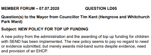 Councillor Tim Kent for Hengrove and Whitchurch questioned Bristol mayor Marvin Reed about concerns from the city’s Send community that a new policy for top up funding had been introduced.