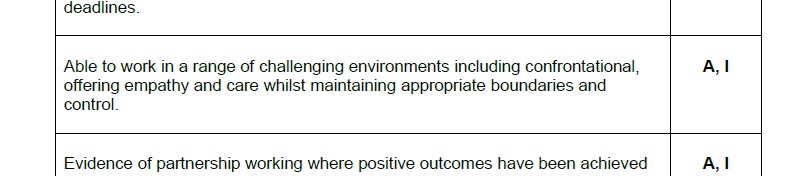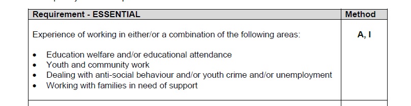 It includes experience of working in education welfare or attendance, dealing with anti-social behaviour/youth crime or unemployment as a requirement of the job.