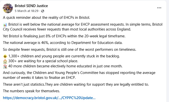 Following the meeting, Bristol Send Justice said: “A quick reminder about the reality of EHCPs in Bristol.