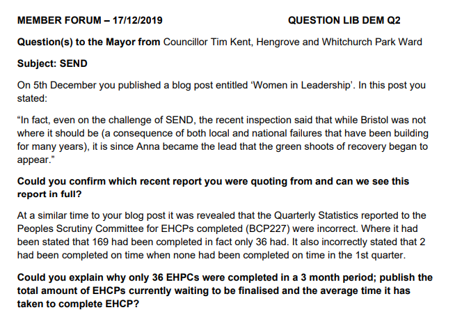 Councillor Tim Kent, Hengrove and Whitchurch Park Ward, questioned the mayor about the post at Member Forum on 17/12/19.