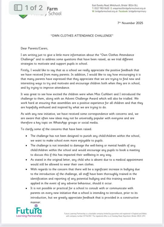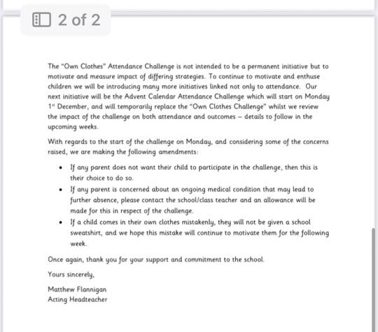 The letter also said that the school will ‘temporarily’ replace the Own Clothes Challenge with an ‘Advent Calendar Attendance Challenge’ while it reviews the ‘impact of the challenge on both attendance and outcomes.’