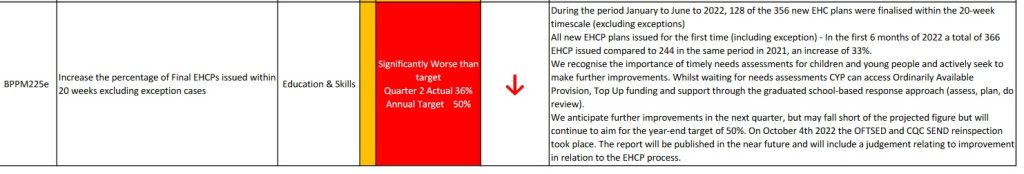 ‘We anticipate further improvements in the next quarter, but may fall short of the projected figure but will continue to aim for the year?end target of 50%. On October 4th 2022 the OFTSED and CQC SEND reinspection took place. The report will be published in the near future and will include a judgement relating to improvement in relation to the EHCP process.’