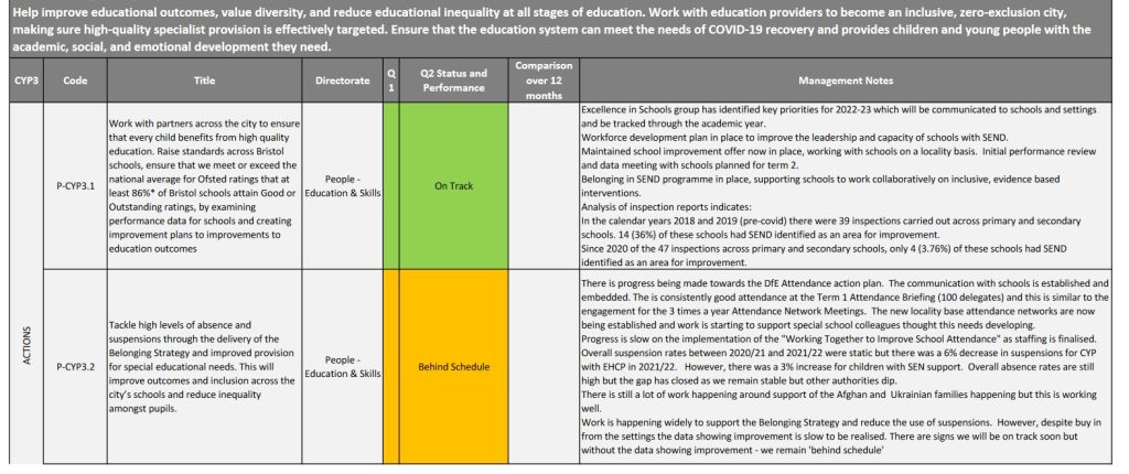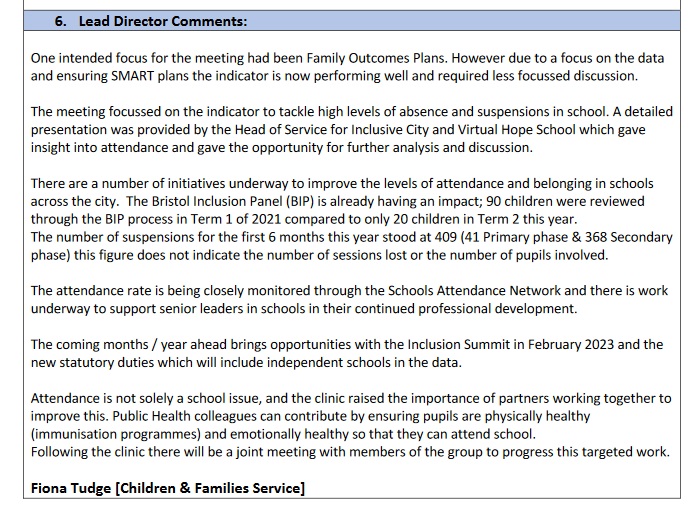 Lead Director comments from Fiona Tudge for the Children and Families Service said: ‘A detailed presentation was provided by the Head of Service for Inclusive City and Virtual Hope School which gave insight into attendance and gave the opportunity for further analysis and discussion. The meeting focussed on the indicator to tackle high levels of absence and suspensions in school. There are a number of initiatives underway to improve the levels of attendance and belonging in schools across the city. The Bristol Inclusion Panel (BIP) is already having an impact; 90 children were reviewed through the BIP process in Term 1 of 2021 compared to only 20 children in Term 2 this year.’