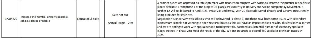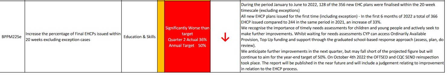 ‘We anticipate further improvements in the next quarter, but may fall short of the projected figure but will continue to aim for the year?end target of 50%. On October 4th 2022 the OFTSED and CQC SEND reinspection took place. The report will be published in the near future and will include a judgement relating to improvement in relation to the EHCP process.’