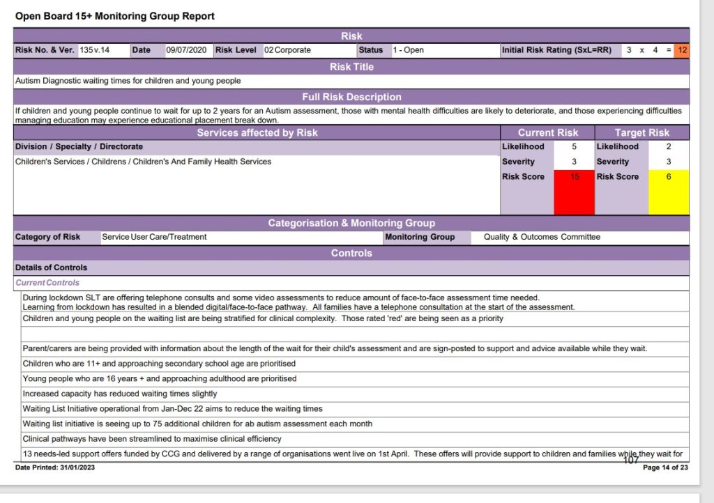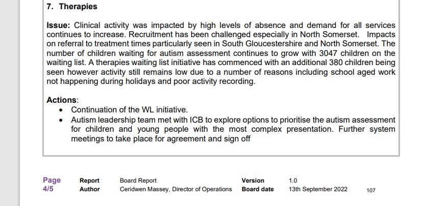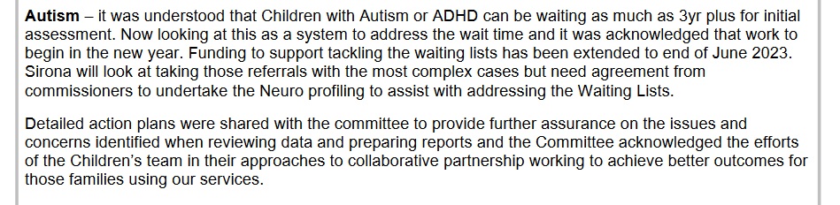 Papers say: ‘Autism – it was understood that Children with Autism or ADHD can be waiting as much as 3yr plus for initial assessment. Now looking at this as a system to address the wait time and it was acknowledged that work to begin in the new year. Funding to support tackling the waiting lists has been extended to end of June 2023. Sirona will look at taking those referrals with the most complex cases but need agreement from commissioners to undertake the Neuro profiling to assist with addressing the Waiting Lists.