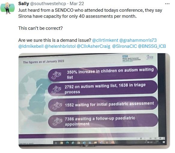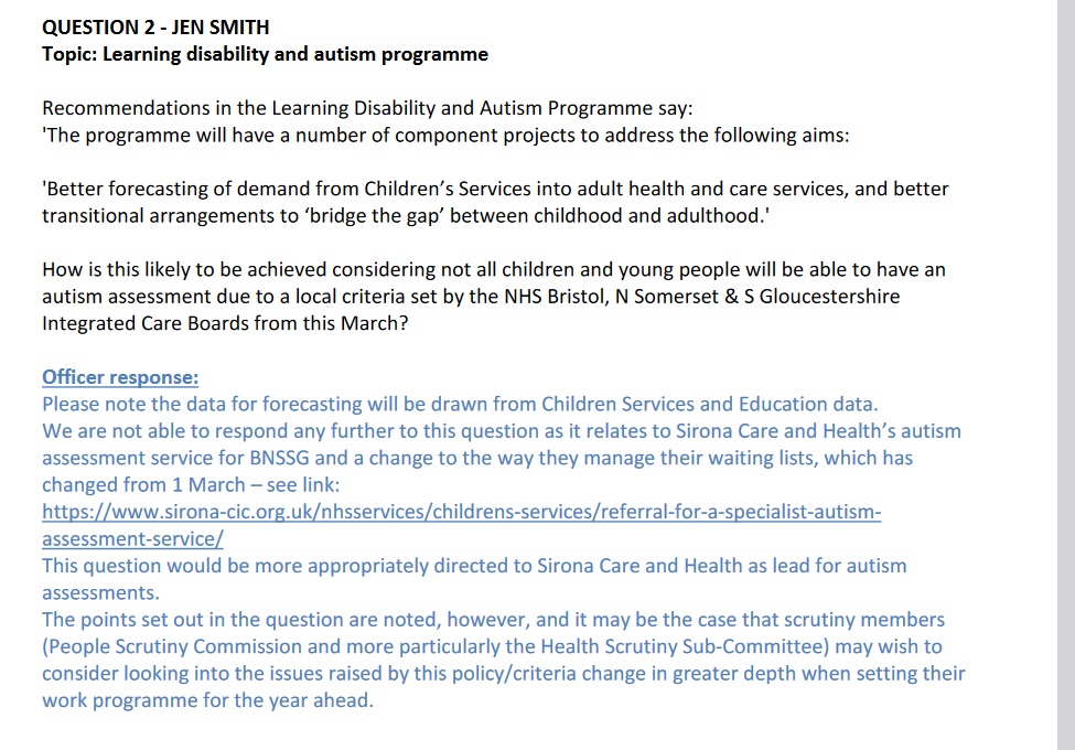 ‘We are not able to respond any further to this question as it relates to Sirona Care and Health’s autism assessment service for BNSSG and a change to the way they manage their waiting lists, which has changed from 1 March – see link: https://www.sirona-cic.org.uk/nhsservices/childrens-services/referral-for-a-specialist-autism-assessment-service/