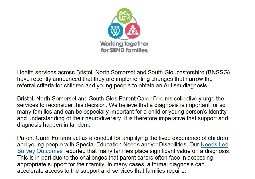 Bristol, North Somerset and South Gloucestershire Parent Carer Forums released a statement urging health services to reconsider the criteria.