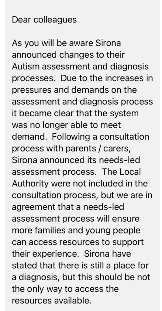 The email said: ‘ Dear colleagues As you will be aware Sirona announced changes to their autism assessment and diagnosis processes. Due to the increases in pressures and demands on the assessment and diagnosis processes it became clear that the system was no longer able to meet demand. Following a consultation process with parents/carers, Sirona announced its needs-led assessment process. The Local Authority were not included in the consultation process, but we are in agreement that a needs-led assessment process will ensure more families and young people can access resources to support their experience. Sirona have stated that there is still a place for a diagnosis but this should not be the only way to access the resources available.’