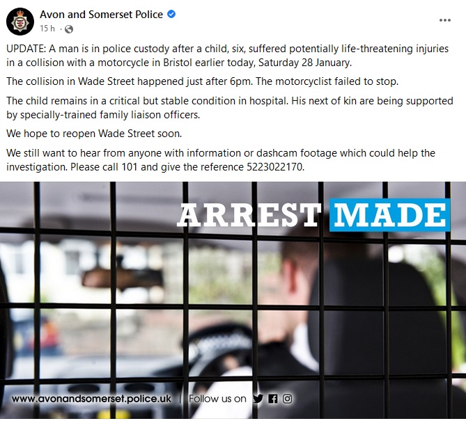 An update from Avon and Somerset Police last night stated said that: ‘ A man is in police custody after a child, six, suffered potentially life-threatening injuries in a collision with a motorcycle in Bristol earlier today, Saturday 28 January.