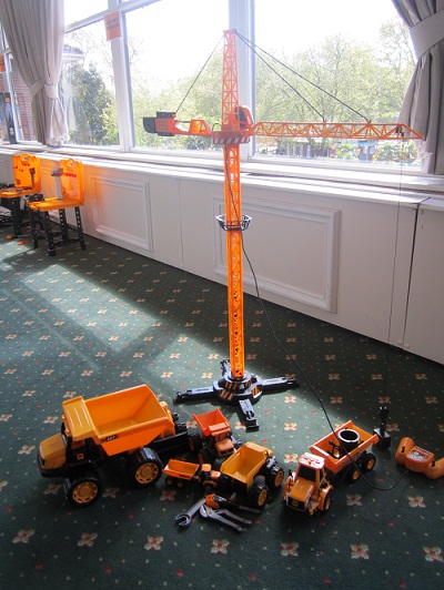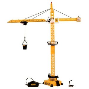 A remote control crane standing 120cm high. Use the remote to swing the crane arm left to right and move the hook up and down.