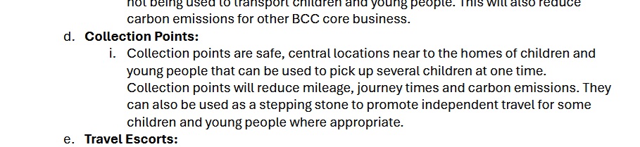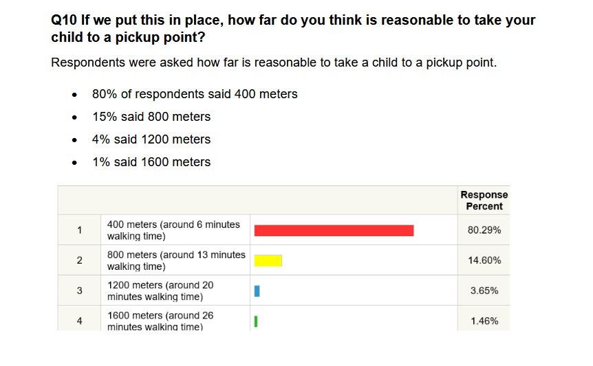 The report says that collection points would be ‘safe’ and ‘near to the homes of children and young people…’. But the council has considered central meeting points as far as a 26 minute walk away from a young person’s home.