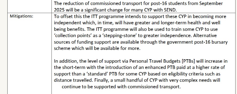Under mitigations in the EIA, it is reported that an Independent Travel Training (ITT) programme is intended to support those affected by transport cuts. This, according to the council, will make Send children ‘more independent’. Additionally, the paper says, that this will mean that Disabled children and young people will see ‘greater and longer-term health and well being benefits’.