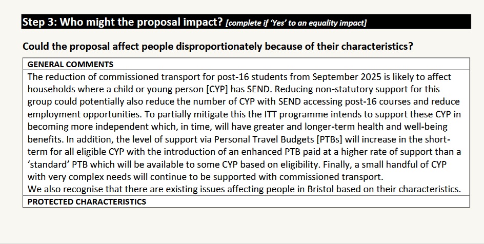 According to a report going to Children and Young People Policy Comittee this month, Bristol City Council is reducing transport for post-16 students from this September. Its Equality Impact Assessment (EIA) says that this could potentially ‘reduce’ the number of Send students accessing post-16 courses. The council says the cuts could also ‘reduce employment opportunities’ for Send students.