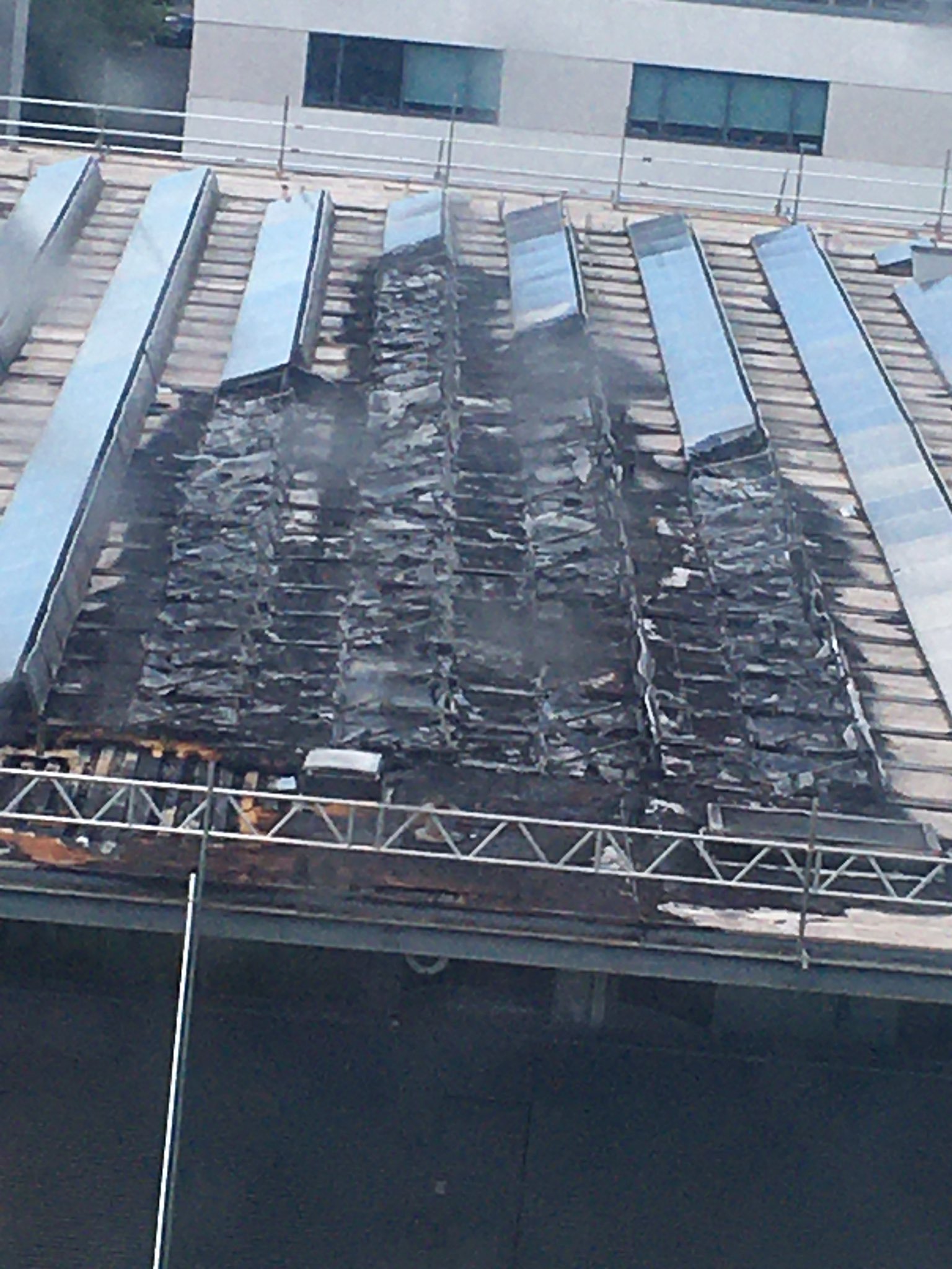 On 09 April, the building was evacuated when a fire started on the roof of the building. It was later found that birds had damaged the photovoltaic solar panels on the roof sparking a fault in the electrical system.