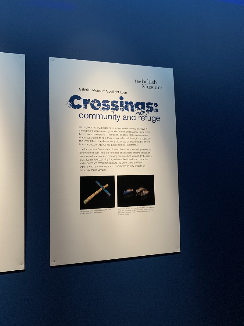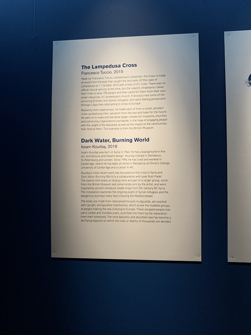 The cross is displayed with Syrian-born artist, Issam Kourbaj’s Dark Water, Burning World. Tiny boats have been crafted from repurposed bicycle mudguards filled with burnt matches. The art represents the fragile vessels refugees use on their dangerous voyages.