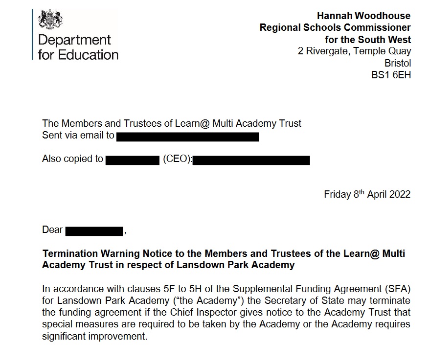 The Regional Schools Commissioner for the South West, Hannah Woodhouse, has now sent a Termination Warning Notice to trustees. It requests information about the action being taken to make ‘sufficient improvements’ by way of a post-inspection action plan and timescales for delivery.