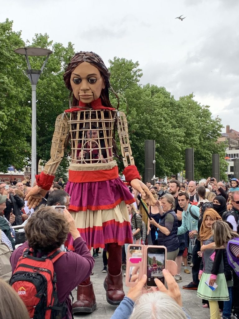 Little Amal is a large puppet of a young Syrian girl, who has been traveling the world to focus attention on the urgent needs of young refugees.