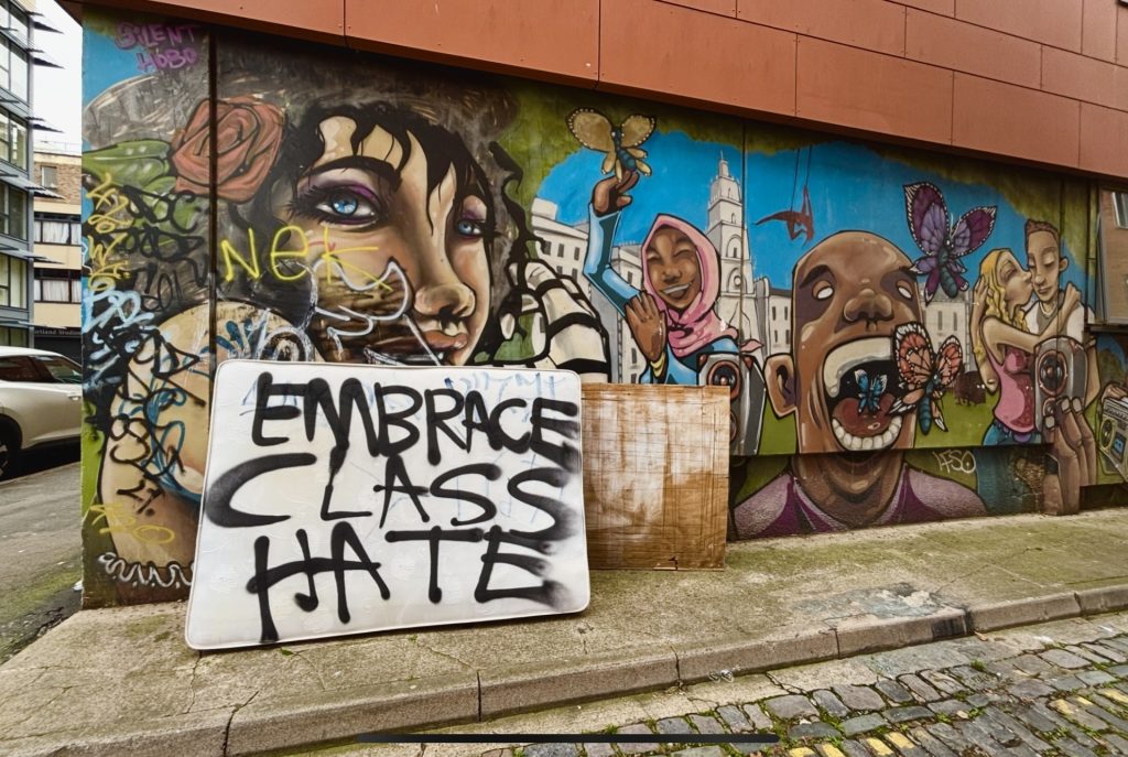 Street art, fly tipping and grafitti comes together on Chapter Street in St Paul’s with the message ‘Embrace Class Hate’.