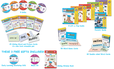The full kit includes 5 sequential DVDs with 5 matching Life-A-Flap books and sets of sliding word cards, 50 game word cards and 82 double-sided word cards.