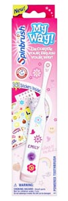 The Spinbrush comes in white and blue and white and pink, with 141 decorative stickers.