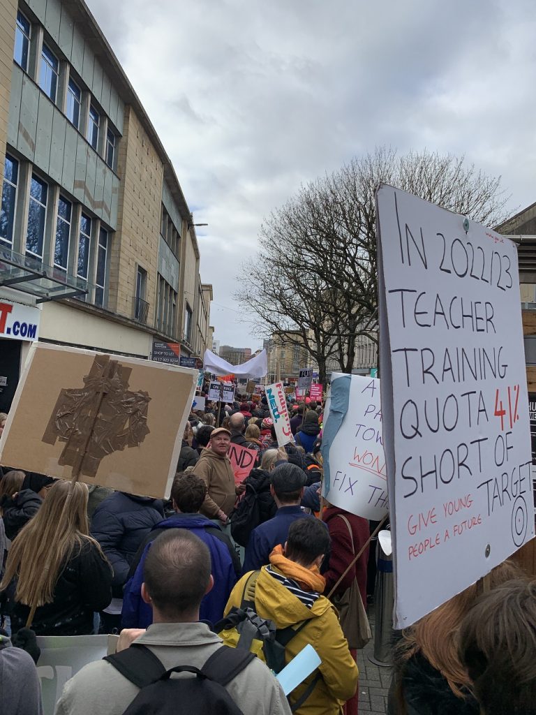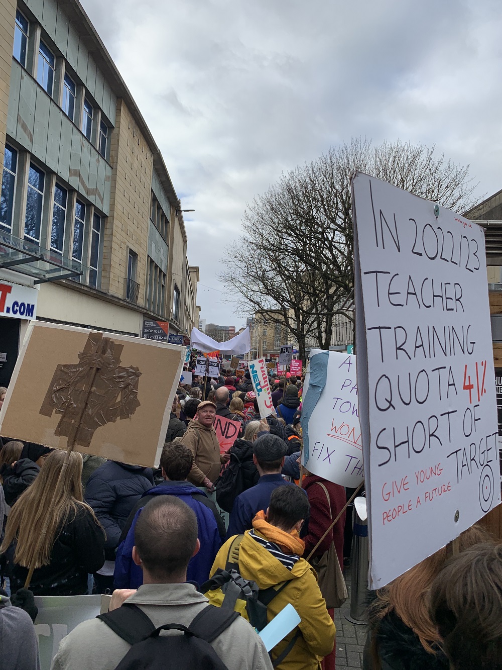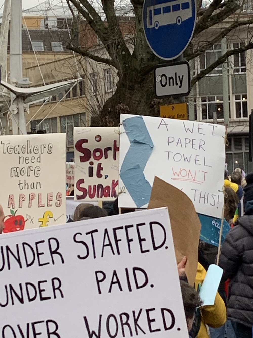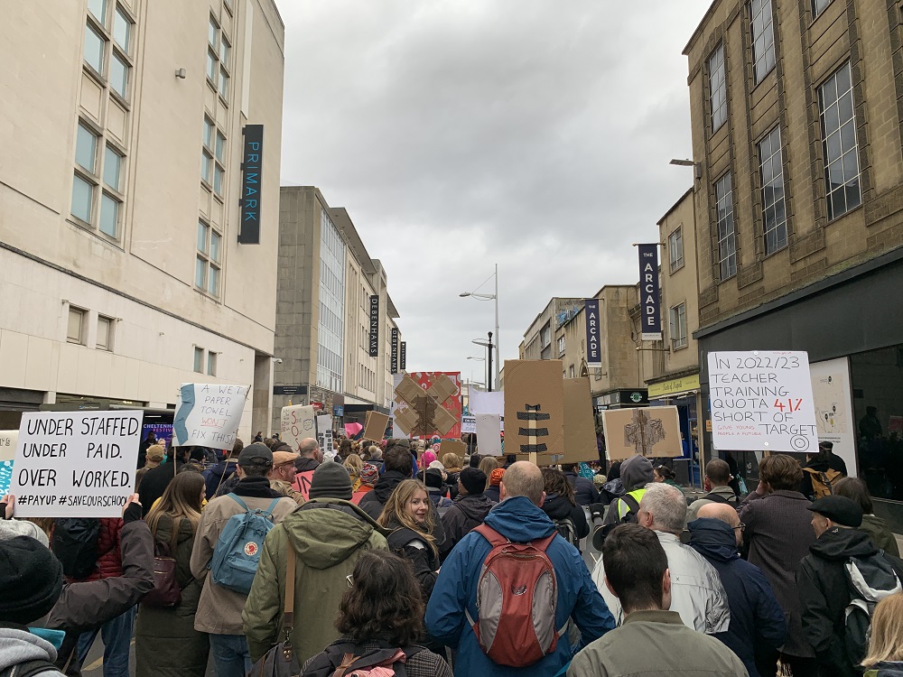Hundreds of teachers in Bristol took to the streets in protest this week, calling for fair pay for teachers from the government to save schools. Picket lines appeared outside of education settings across the city. A huge gathering met in College Green before marching through central Bristol, returning for a rally.