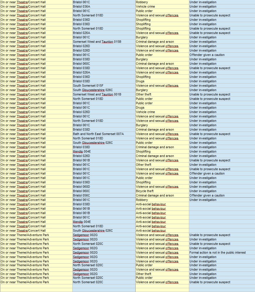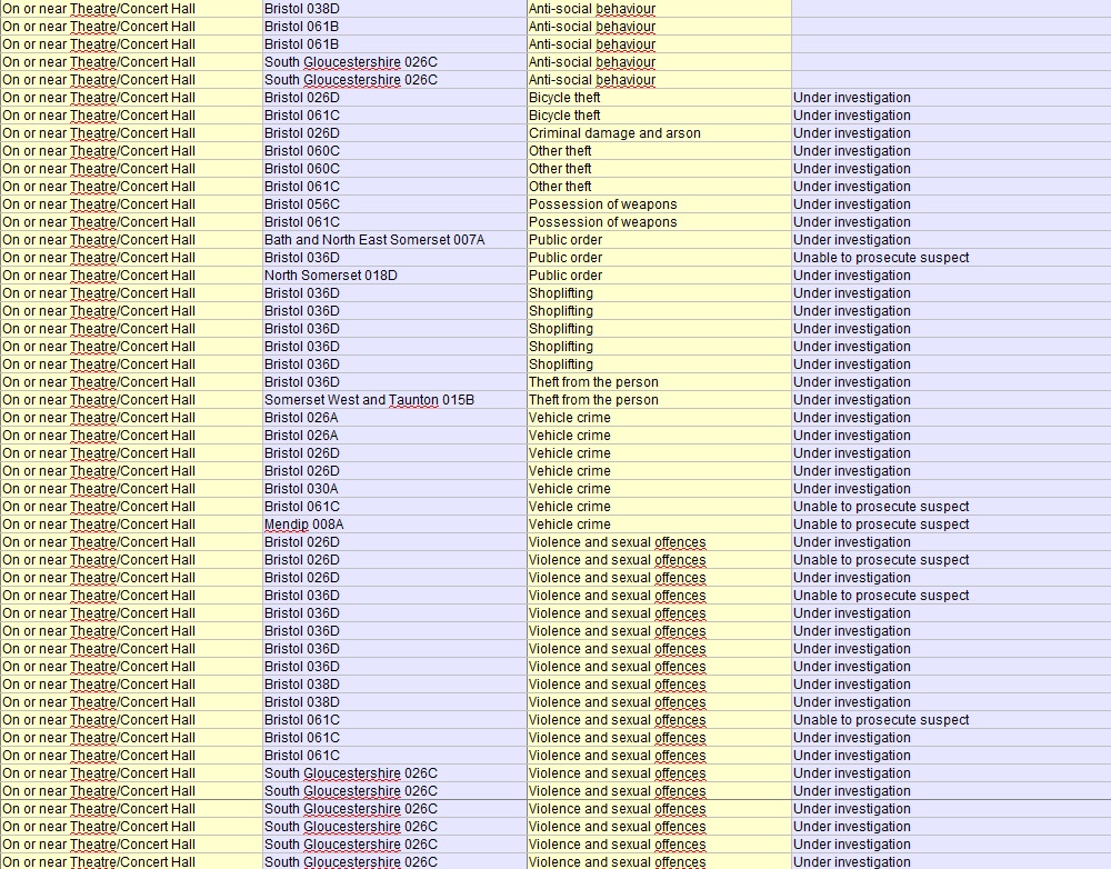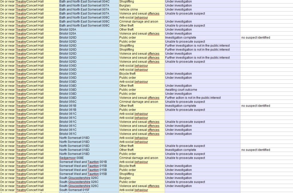 Avon and Somerset Police crime statistics from Police.UK shows crimes logged ‘on or near’ particular streets or locations. It also logs the number of crimes which happen ‘on or near theatres or concert halls’.