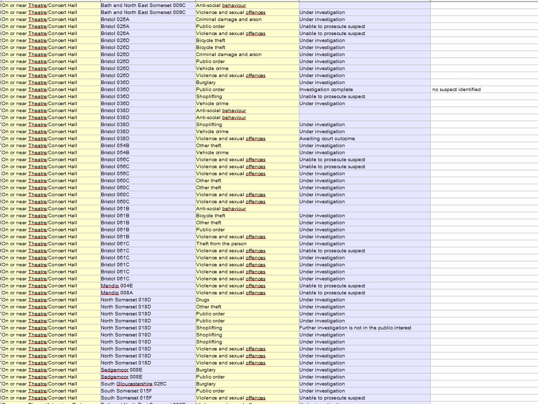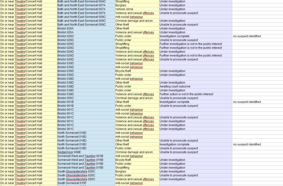 Avon and Somerset Police crime statistics from Police.UK shows crimes logged ‘on or near’ particular streets or locations. It also logs the number of crimes which happen ‘on or near theatres or concert halls’.