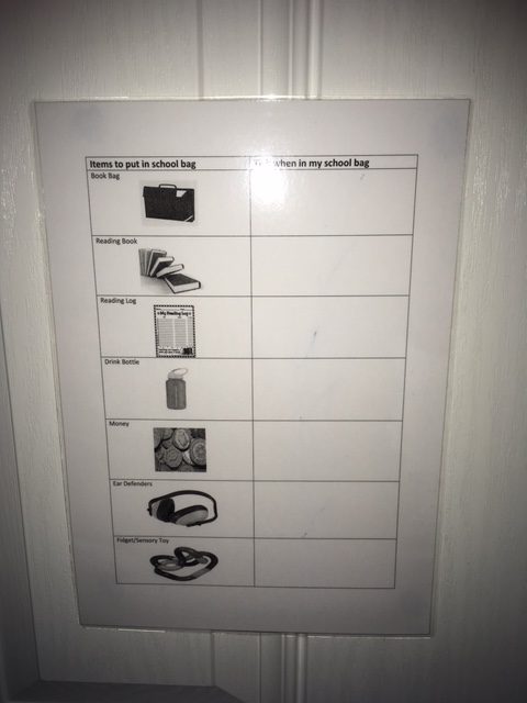This kind of laminated visual reminder helps children organise themselves for the day. They can use a whiteboard pen to tick off each thing as they have done it.